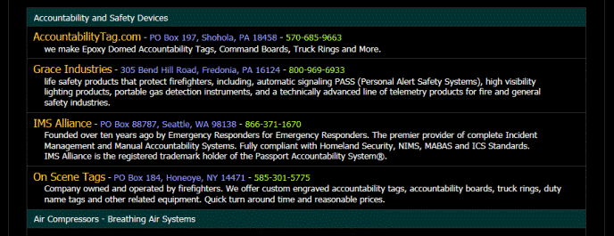 Your company can be listed in the Fire / EMS Buyers Guide section for only $10 per site, and THE LISTINGS DO NOT EXPIRE. Get every site we have, all for just $10 per site. You can purchase additional categories if needed.